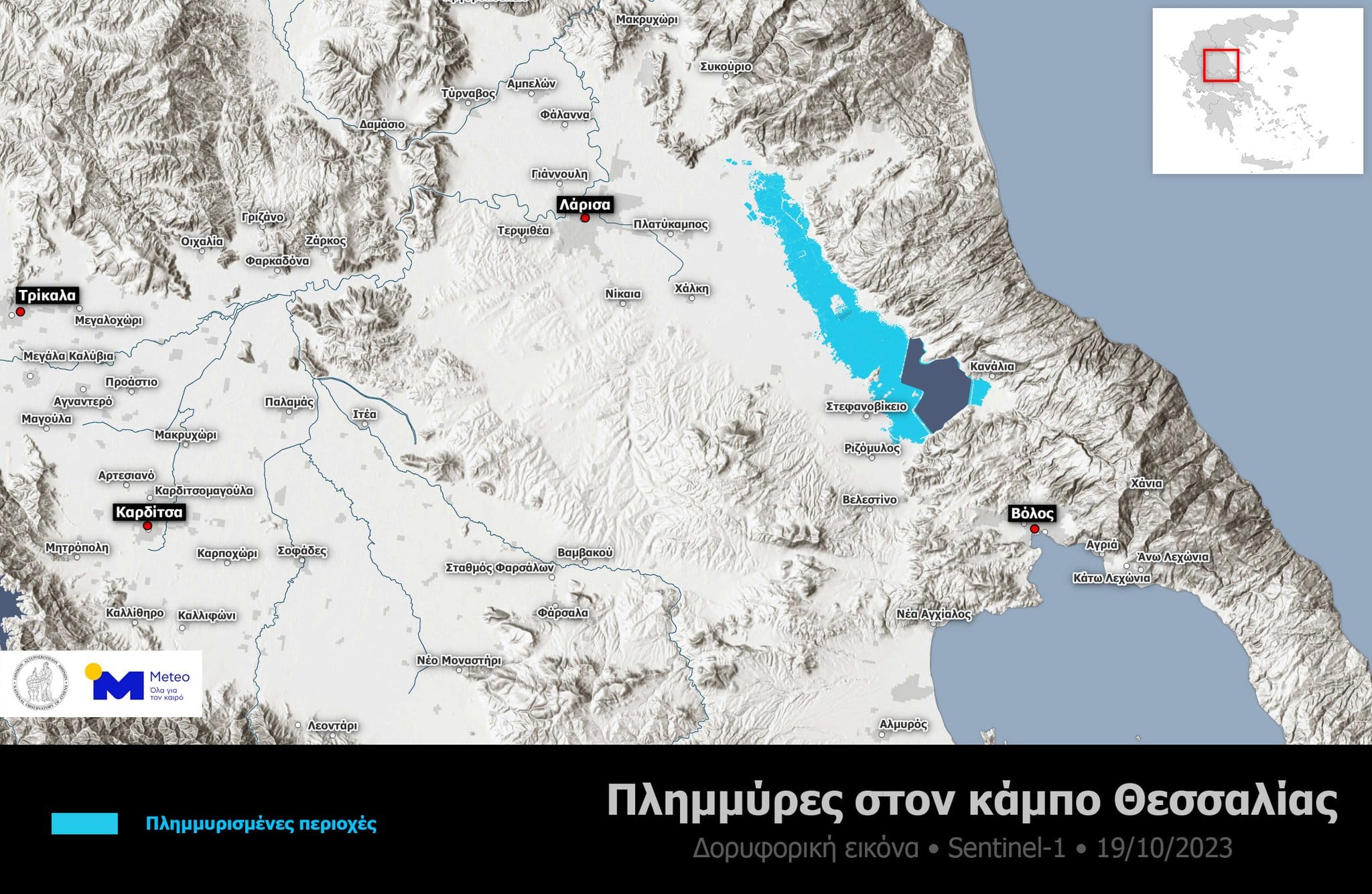 Δορυφορικά δεδομένα από το ραντάρ των ευρωπαϊκών δορυφόρων Sentinel-1 & Sentinel-2 που πέρασαν πάνω από τη χώρα μας το διάστημα 07.09.2023 – 19.10.2023, κατέγραψαν σε πολύ υψηλή ανάλυση τις περιοχές του κάμπου της Θεσσαλίας που ήταν πλημμυρισμένες για περισσότερες από 15-20 ημέρες. Η επεξεργασία και η οπτικοποίηση των δορυφορικών δεδομένων πραγματοποιήθηκε από τη μονάδα meteo.gr/Ε.Α.Α.