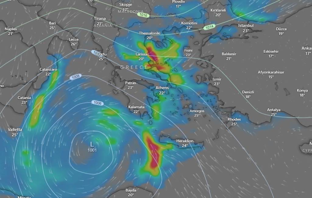 Επιδείνωση θα παρουσιάσει ο καιρός στη χώρα μας από τη Δευτέρα 4-9-2023 έως την Τετάρτη 6-9-2023 με ισχυρές βροχές και καταιγίδες που θα συνοδεύονται από χαλαζοπτώσεις και μεγάλη συχνότητα κεραυνών, με ενισχυμένους ανέμους και αισθητή πτώση της θερμοκρασίας. Βαρομετρικό χαμηλό από τα βόρεια Βαλκάνια με ψυχρές αέριες μάζες προβλέπεται να κινηθεί νότια (έως το νότιο Ιόνιο) και θα επηρεάσει τις περισσότερες περιοχές της χώρας μας.