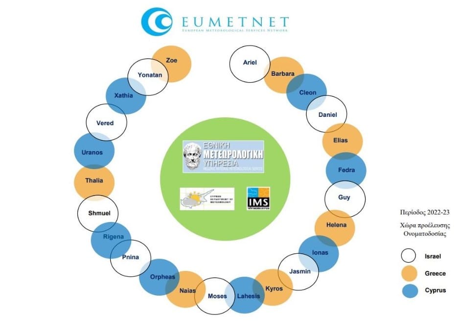Η ΕΜΥ, έχει ξεκινήσει από το 2021 σε συνεργασία με τις Μετεωρολογικές Υπηρεσίες της Κύπρου και του Ισραήλ, την ονοματοδοσία τέτοιων συστημάτων κατά τη διάρκεια της ψυχρής αλλά και της θερμής περιόδου του έτους, συγκροτώντας την ομάδα της ανατολικής Μεσογείου. Πιο συγκεκριμένα, η ΕΜΥ επικοινωνεί σε εβδομαδιαία βάση με τις Μετεωρολογικές Υπηρεσίες της Κύπρου και του Ισραήλ, ανταλλάσσοντας απόψεις σχετικά με την εξέλιξη της κίνησης των καιρικών συστημάτων που αναμένεται να επηρεάσουν την περιοχή της ανατολικής Μεσογείου, ενώ παράλληλα με τη χρήση όλων των διαθέσιμων σύγχρονων προγνωστικών προϊόντων αποφασίζεται, ανάλογα με την ένταση των αναμενόμενων φαινομένων, η ονοματοδοσία τους (ή όχι).