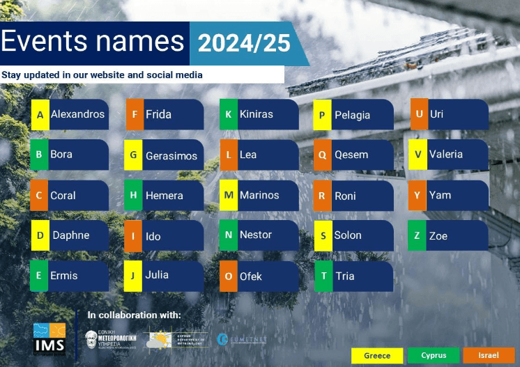 Για τη περίοδο Οκτωβρίου 2024-Σεπτεμβρίου 2025, η λίστα με τα ονόματα που επιλέχθηκαν και θα χρησιμοποιούνται με αλφαβητική σειρά, καταρτίστηκε από κοινού μεταξύ των τριών Μετεωρολογικών Υπηρεσιών, αντανακλώντας το γλωσσικό ιδίωμα των χωρών τους με λατινικούς χαρακτήρες και είναι: