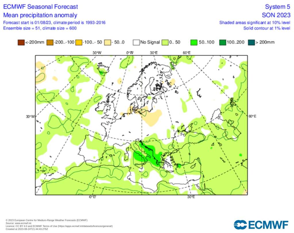 Από πλευράς βροχοπτώσεων, το ECMWF, και για το φθινόπωρο συνεχίζει το θερινό μοτίβο, που, ενώ τοπικά στη βόρεια Ευρώπη προβλέπονται μάλλον ξηρότερες συνθήκες από τις κανονικές για την εποχή, για τα νότια τμήματα της Ευρωπαϊκής ηπείρου και τη Μεσόγειο, η φθινοπωρινή περίοδος θα είναι σχετικά υγρή. Οι μεγαλύτερες αποκλίσεις εμφανίζονται τοπικά στην Ιταλία, Αδριατική, δυτικά βαλκάνια-βορειοδυτική Ελλάδα και στη θαλάσσια περιοχή Δωδεκανήσων-Κύπρου. Επίσης αξίζει να σημειωθούν και οι θετικές αποκλίσεις στον Βόρειο Ατλαντικό Ωκεανό, στην βόρεια Αφρική και στην Τουρκία – Μέση Ανατολή.