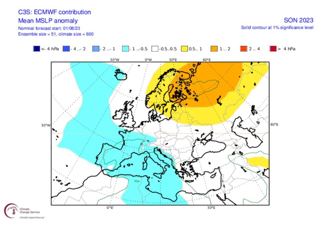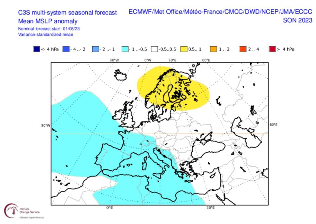 Προγνωστικοί χάρτες του ECMWF και του C3Smulti-modelsystem με τις αποκλίσεις της ατμοσφαιρικής (βαρομετρικής) πίεσης στην επιφάνεια (MSLP) για το Φθινόπωρο του 2023 (3-monthaverage), με αρχικές τιμές της 01/08/2023