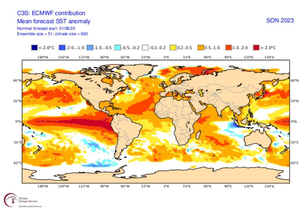 Προγνωστικός χάρτης του ECMWF με τις αποκλίσεις της θερμοκρασίας της επιφάνειας της θάλασσας (SST–SeaSurfaceTemperature) για τον για το φθινόπωρο 2023 (3-month average), με αρχικές τιμές της 01/08/2023