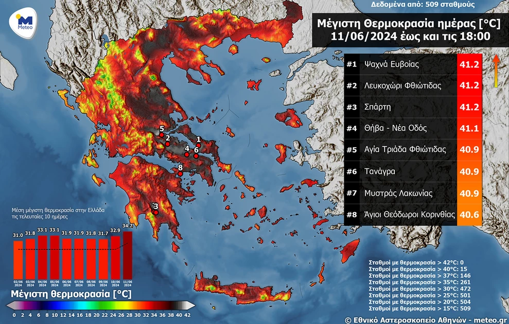 Υψηλότατες θερμοκρασίες καταγράφηκαν από το δίκτυο αυτόματων μετεωρολογικών σταθμών του meteo.gr/ Εθνικού Αστεροσκοπείου Αθηνών την Τρίτη 11/6, με τον υδράργυρο να ξεπερνά τους 41 βαθμούς Κελσίου στα ανατολικά ηπειρωτικά.