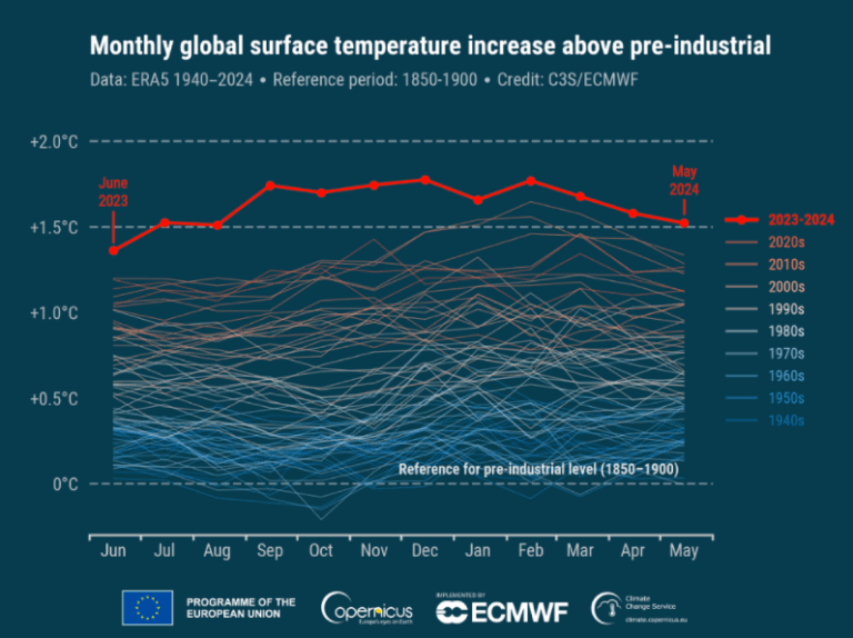 Reflecting this series of record monthly temperatures, the global average temperature for the past 12 months (June 2023 – May 2024) is the highest ever recorded, 0.75°C above the 1991-2020 average and 1.63°C above the pre-industrial average, according to C3S.