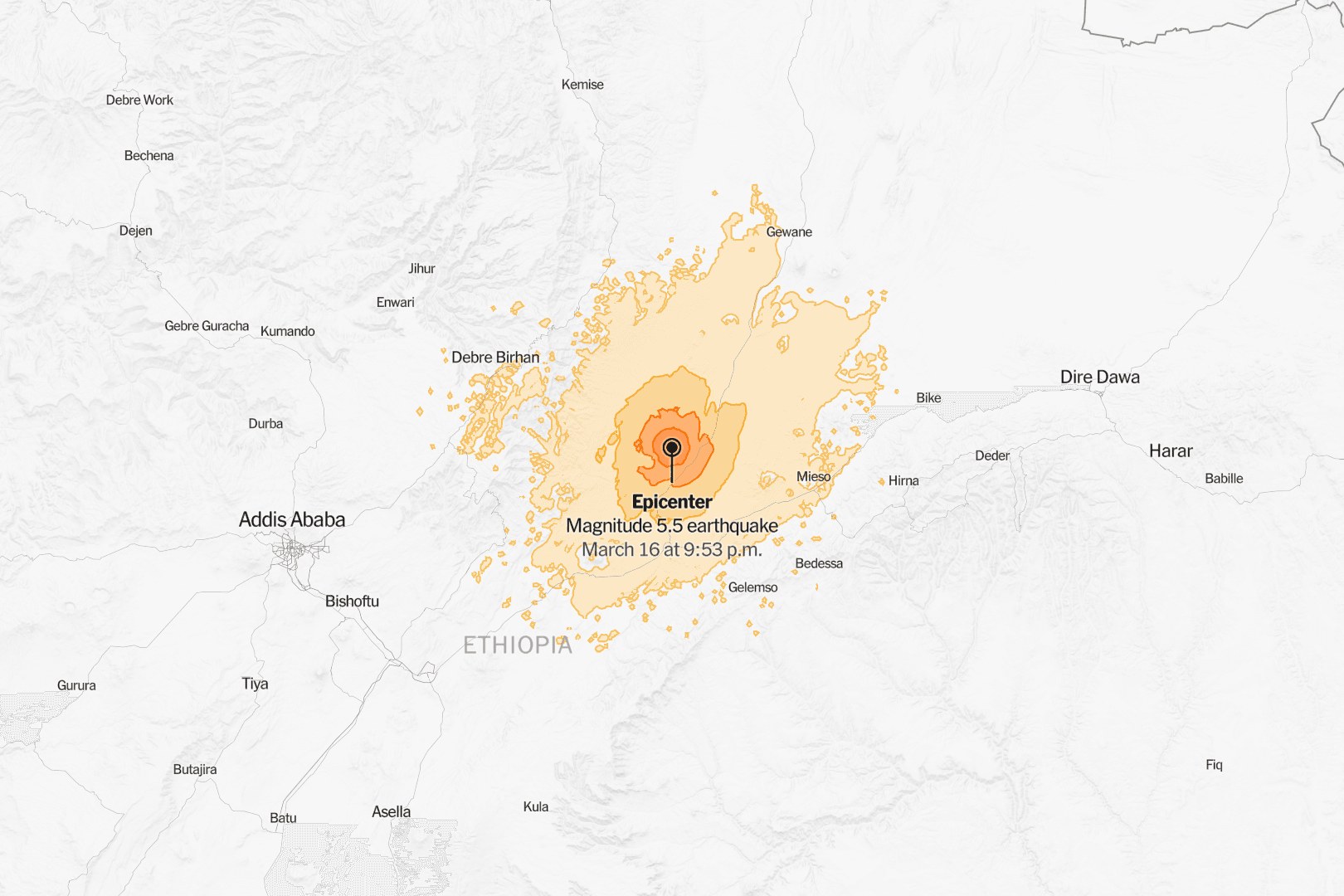 A moderately strong, 5.5-magnitude earthquake struck in Ethiopia on Sunday, according to the United States Geological Survey.