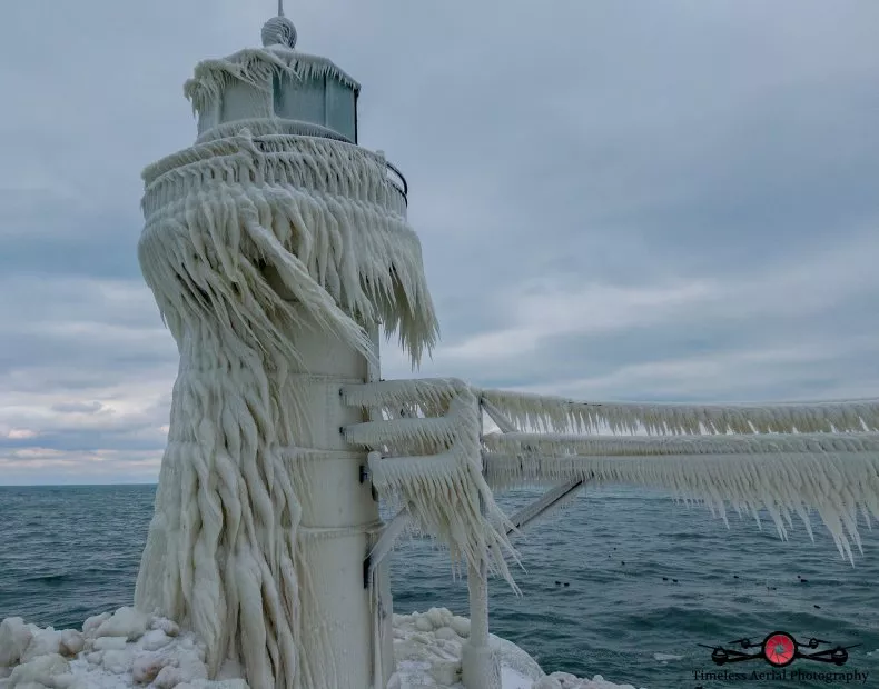 Footage of well-known landmarks, such as the South Haven lighthouse and the St. Joseph lighthouse, were captured following an intense blizzard in the area. Icicles can be seen hanging from lighthouses and piers to the point where the structures are nearly covered in ice.