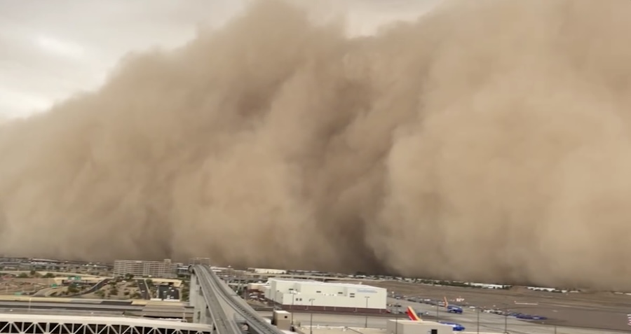 A monsoon storm fronted by a massive wall of dust bowled through the Phoenix area on the evening of Aug. 25, knocking out power to thousands, delaying flights and damaging Phoenix Sky Harbor International Airport.