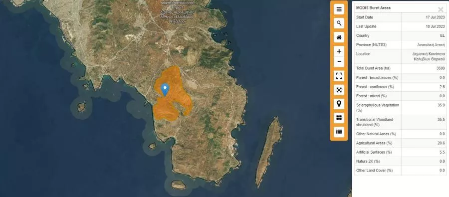 Τεράστια είναι η οικολογική καταστροφή από τις φωτιές σε δυτική και ανατολική Αττική, Λουτράκι και Ρόδο σύμφωνα με την υπηρεσία Copernicus. Μέχρι στιγμής έχουν καεί πάνω από 170.000 στρέμματα.