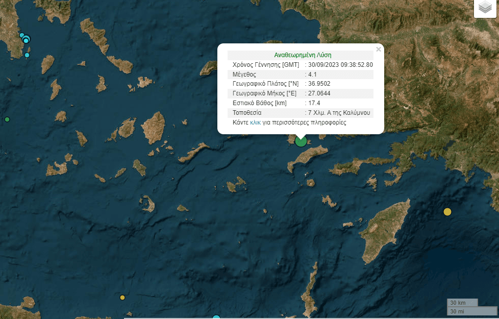 Σεισμός μεγέθους 4,1 Ρίχτερ σημειώθηκε το μεσημέρι του Σαββάτου (30/9) στην Κάλυμνο. Η δόνηση έγινε ιδιαίτερα αισθητή και στην Κω.