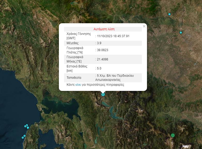 Σεισμός 3,9 Ρίχτερ σημειώθηκε στις 21:45 στην Αιτωλοακαρνανία.