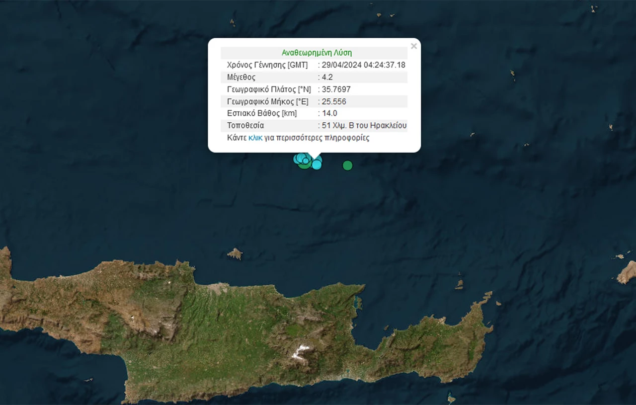 Σεισμός μεγέθους 4,2 βαθμών της κλίμακας Ρίχτερ σημειώθηκε το πρωί της Μεγάλης Δευτέρας στις 07:24 ανοιχτά της Κρήτης.