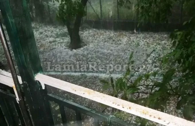Ειδικά στο Νεοχώρι Τυμφρηστού, η γη «άσπρισε» λες και χιόνισε από τη σφοδρή χαλαζόπτωση.