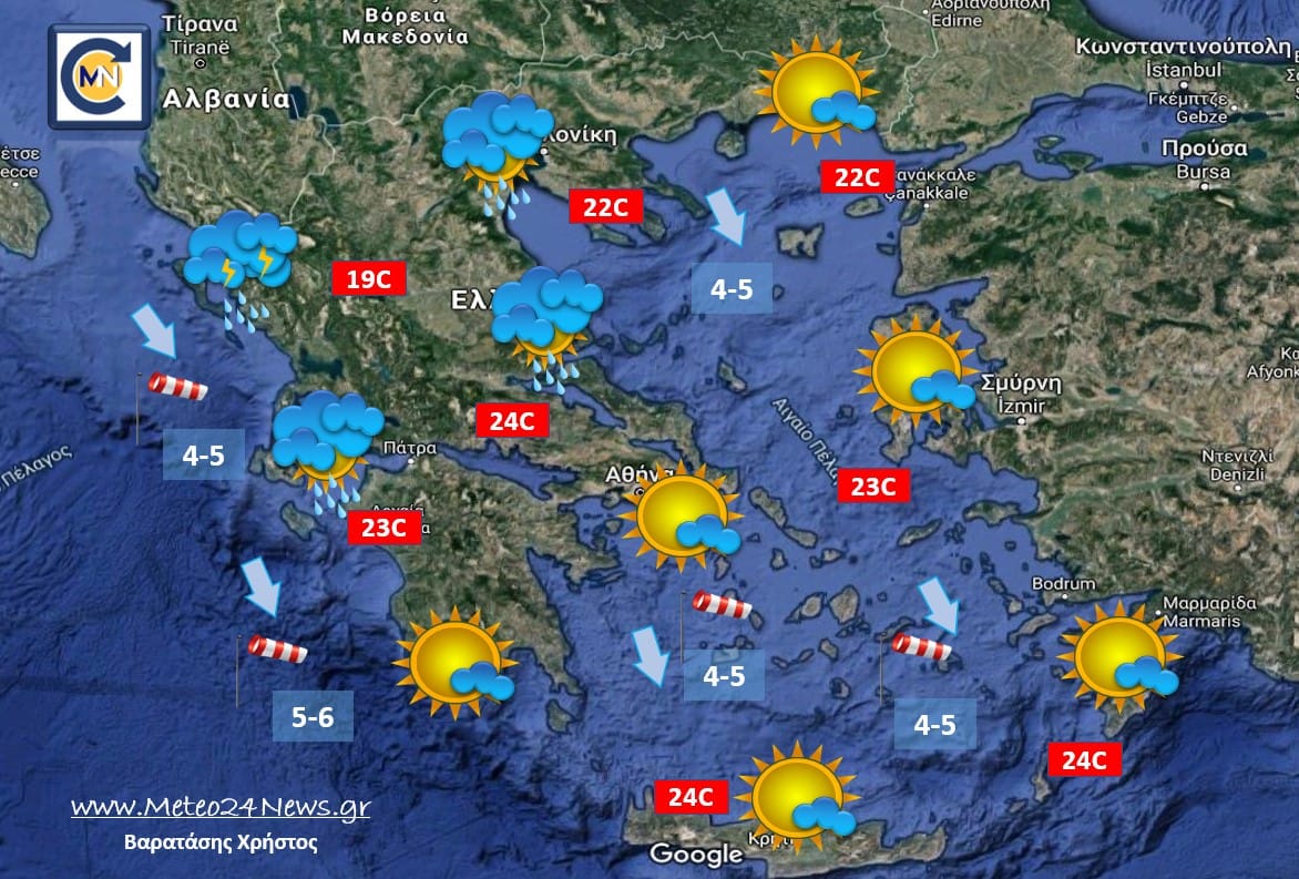 Η θερμοκρασία θα παρουσιάσει μικρή πτώση και θα φτάσει στα βόρεια τους 21 με 22 βαθμούς Κελσίου, στα δυτικά τους 23 με 24 βαθμούς Κελσίου, στα υπόλοιπα ανατολικά Ηπειρώτικα τους 24 με 25 βαθμούς Κελσίου και στα νησιά του Αιγαίου την Κρήτη και τα Δωδεκάνησα τους 23 με 24 βαθμούς Κελσίου.