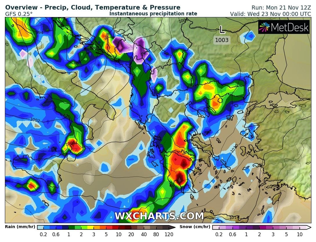 Από τις απογευματινές ώρες τοπικές βροχές και κάποιες σποραδικές καταιγίδες θα σημειωθούν και σε περιοχές της Μακεδονίας, της Θράκης, της κεντρικής Στερεάς, της κεντρικής και Νότιας Πελοποννήσου καθώς επίσης στις Κυκλάδες και στην Κρήτη.