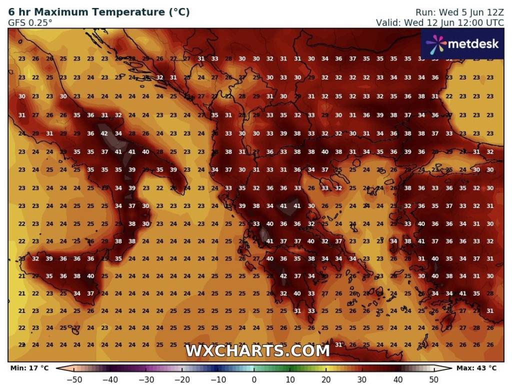 Στον παρακάτω χάρτη μπορείτε να δείτε τις μέγιστες θερμοκρασίες που προβλέπονται για την Τετάρτη 12 Ιουνίου 2024 .