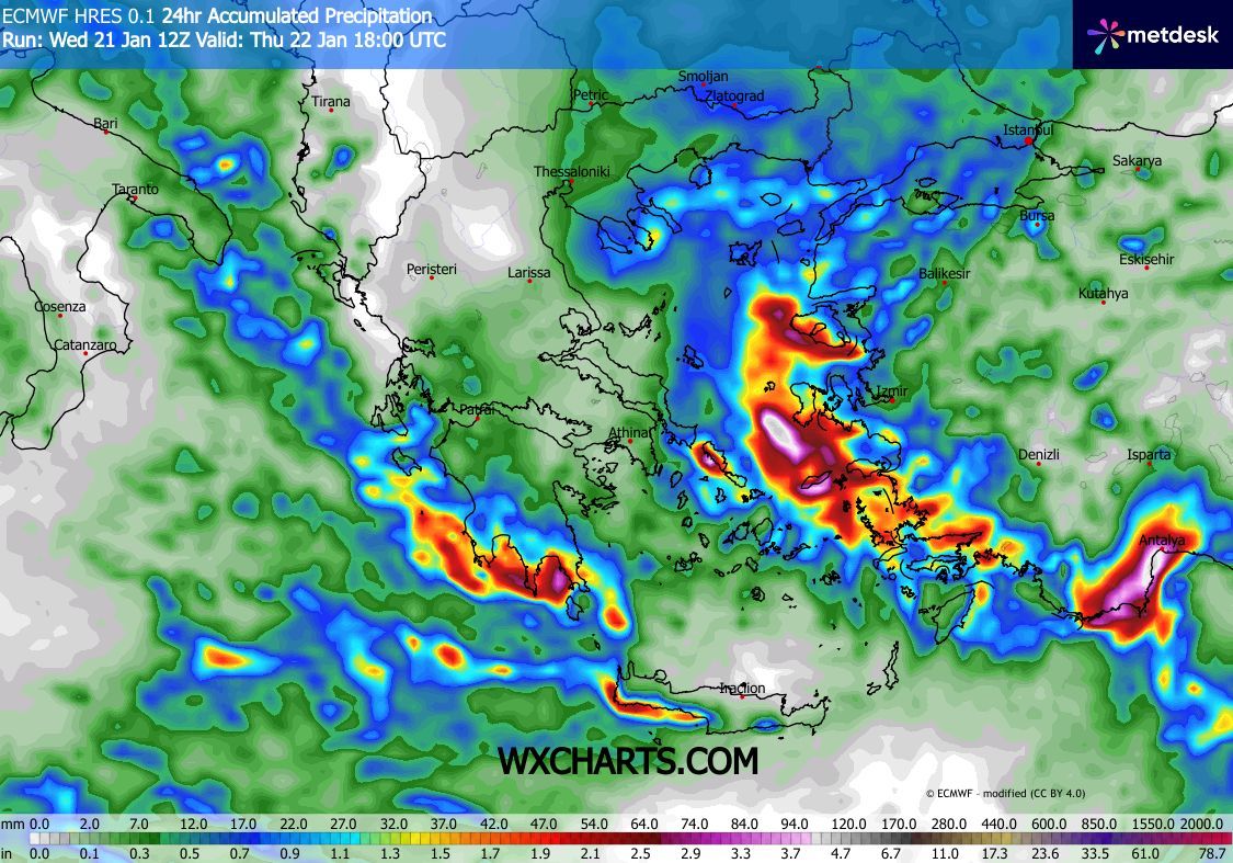 Συνεχίζεται η κακοκαιρία την Πέμπτη 22 Ιανουαρίου 2026, με κύρια χαρακτηριστικά τις ισχυρές βροχοπτώσεις, τις καταιγίδες και τους πολύ ενισχυμένους ανέμους, στο Ανατολικό Αιγαίο και τα Δωδεκάνησα.