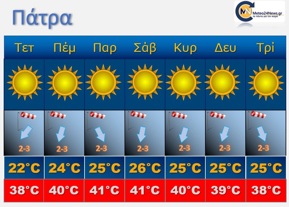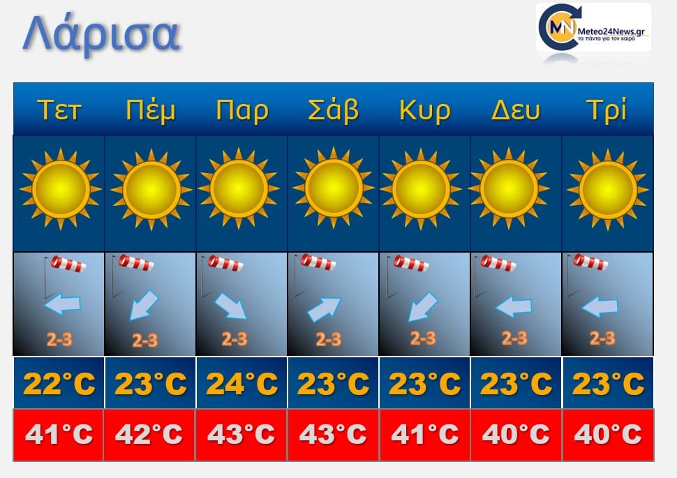 Τμήματα της Μακεδονίας ,της Θεσσαλίας της Στερεάς αλλά και της Πελοποννήσου θα καταγράψουν θερμοκρασίες πάνω απο τους 40-43 βαθμούς Κελσίου με περιοχές στον κάμπο της Θεσσαλίας να δίνουν υποψηφιότητα ακόμα και για 44 βαθμούς Κελσίου .