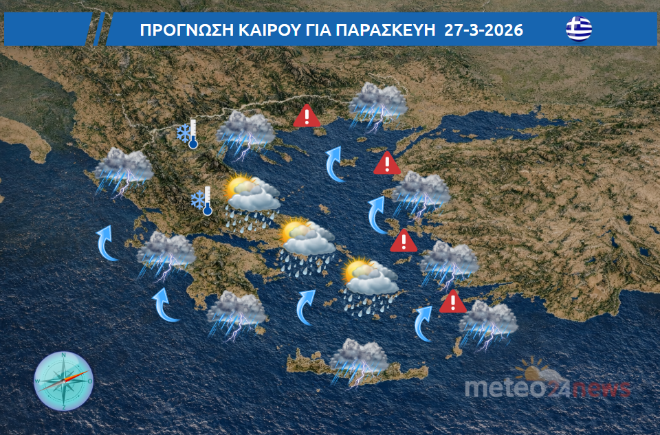 Σημαντική μεταβολή θα παρουσιάσει ο καιρός την Παρασκευή 27 Μαρτίου 2026, με βροχές και καταιγίδες να επηρεάζουν το μεγαλύτερο μέρος της χώρας. Κατά τόπους, κυρίως στα δυτικά, τα βόρεια και το ανατολικό Αιγαίο, τα φαινόμενα ενδέχεται να είναι πρόσκαιρα ισχυρά, ενώ δεν θα λείψουν και οι χιονοπτώσεις στα ορεινά.