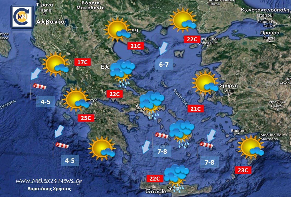 Η θερμοκρασία θα παρουσιάσει πτώση και θα φτάσει στα βόρεια τους 21 με 22 βαθμούς Κελσίου, στα δυτικά τους 24 με 25 βαθμούς Κελσίου, στα υπόλοιπα ανατολικά ηπειρωτικά τους 21 με 23 βαθμούς Κελσίου και στα νησιά του Αιγαίου την Κρήτη και τα Δωδεκάνησα τους 22 με 23 βαθμούς Κελσίου.