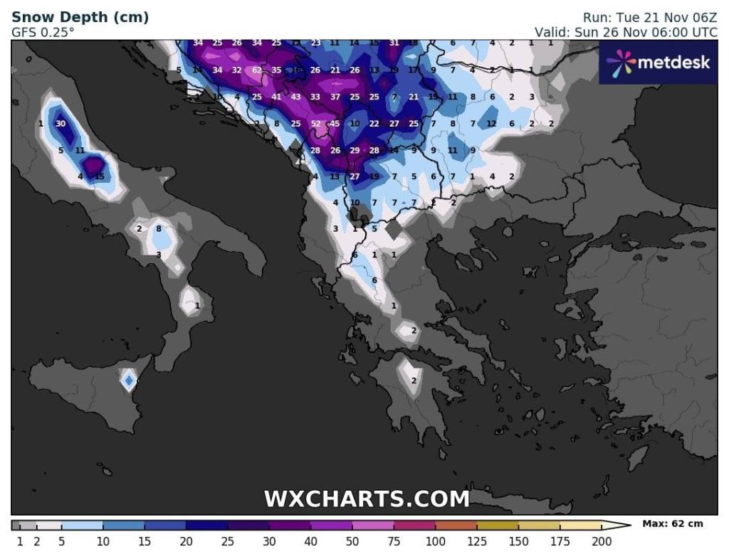 Προς βραδινές ώρες του Σαββάτου και με την νοτιότερη κάθοδο των ψυχρών αέριων μαζών οι βροχοπτώσεις θα μετατραπούν σε χιονοπτώσεις σε ορεινές και ημιορεινές περιοχές της Μακεδονίας και της Θράκης .