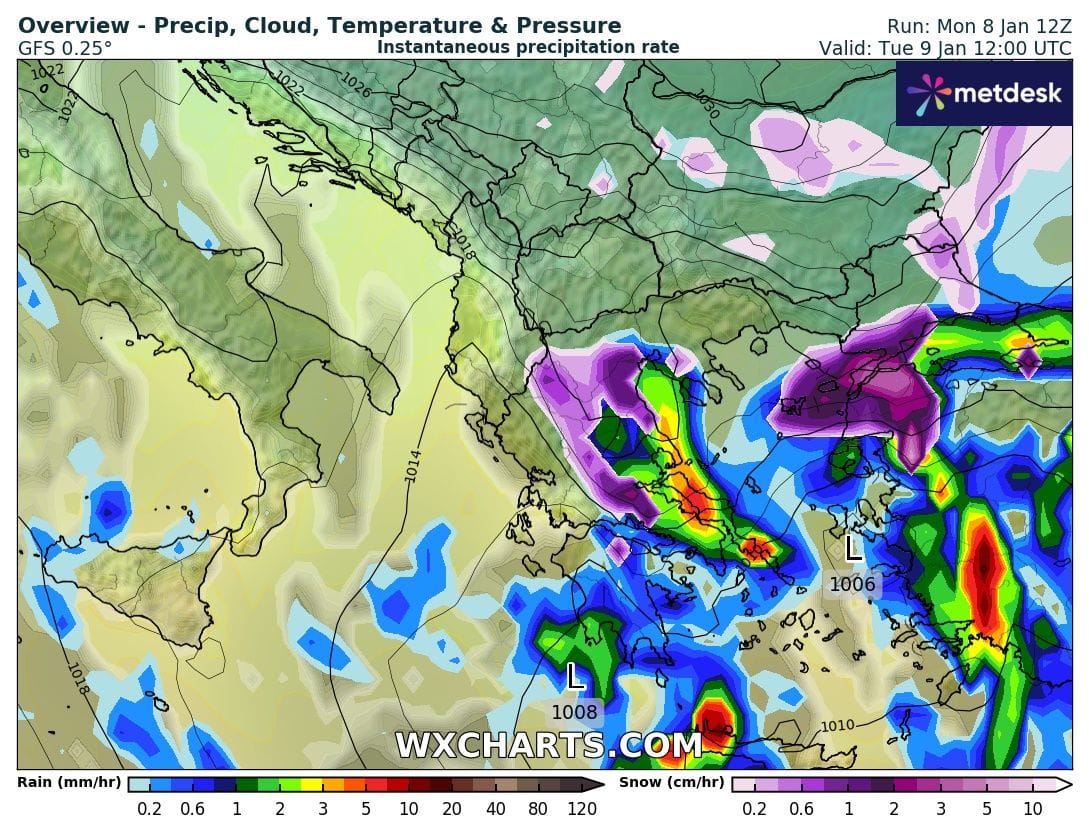 Χιονοπτώσεις θα σημειωθούν στα ορεινά -ημιορεινά τμήματα της κεντρικής και βόρειας Ελλάδας (500-600 μέτρα υψόμετρο και πάνω) οι οποίες θα είναι πιο πυκνές στην Ανατολική Θεσσαλία ,την ανατολική Στερεά και την Εύβοια.