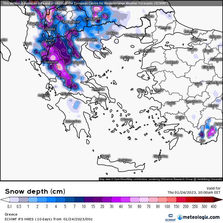 Παρακάτω ακολουθούν οι προγνωστικοί χάρτες του Ευρωπαϊκού Μοντέλου ECMWF για το ύψος χιονόπτωσης έως την Παρασκευή. Όπως θα παρατηρήσετε, στην Πίνδο προβλέπονται πάνω από 80cm νέου χιονιού έως την Παρασκευή.
