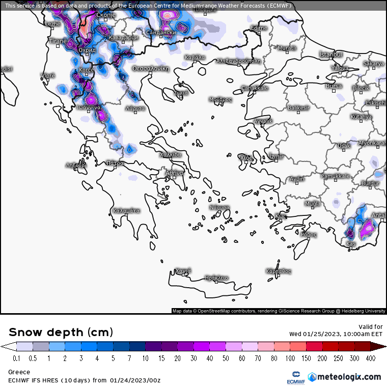 Χάρτης χιονόστρωσης (cm) για Τετάρτη 25/1.