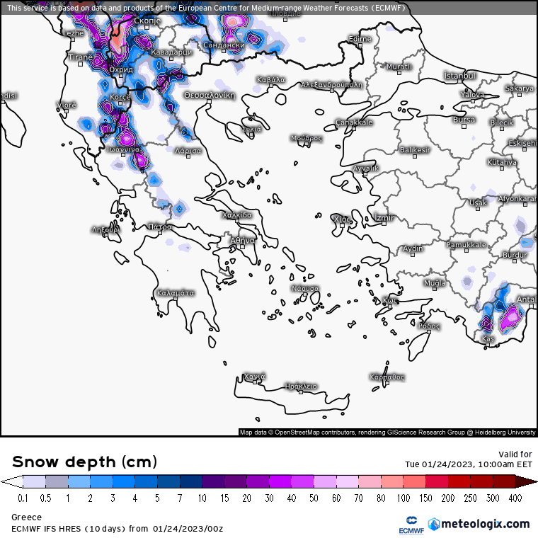 Χάρτης χιονόστρωσης (cm) για Τρίτη 24/1.