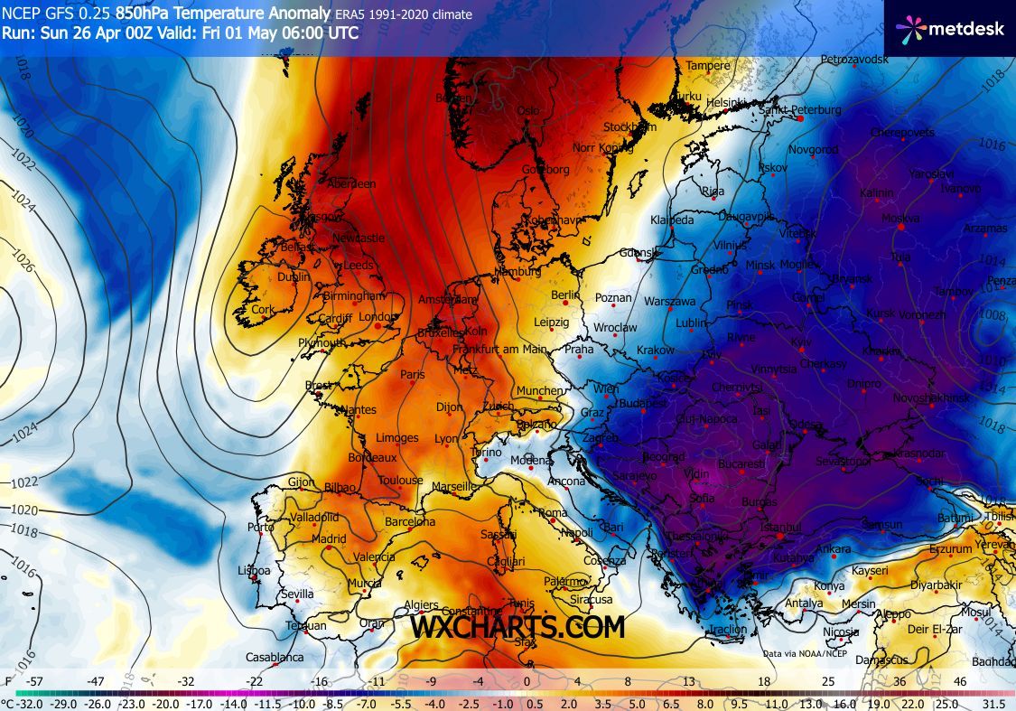 Το πιο εντυπωσιακό στοιχείο αυτής της κατάστασης είναι η έντονη αντίθεση θερμοκρασιών στην Ευρώπη. Ενώ η Δυτική Ευρώπη παραμένει σε θερμό καθεστώς λόγω υψηλών πιέσεων, η Ανατολική και Νοτιοανατολική Ευρώπη, συμπεριλαμβανομένων των Βαλκανίων, θα βρεθούν αντιμέτωπες με ένα ασυνήθιστα ψυχρό περιβάλλον.