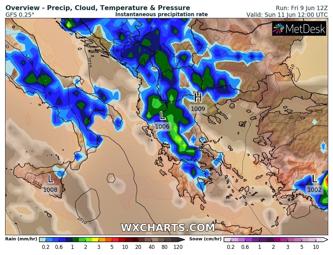 Για την Κυριακή αναμένουμε περαιτέρω ένταση της αστάθειας στις περισσότερες ηπειρωτικές περιοχές της χώρας με μπόρες βροχές και καταιγίδες να επηρεάζουν τις θερμές ώρες της ημέρας τις περισσότερες περιοχές. Τα φαινόμενα σε Ήπειρο, Μακεδονία, Θράκη και Θεσσαλία δεν αποκλείεται κατά τόπους να έχουν και έντονο χαρακτήρα και να συνοδεύονται από τοπικές χαλαζοπτώσεις.