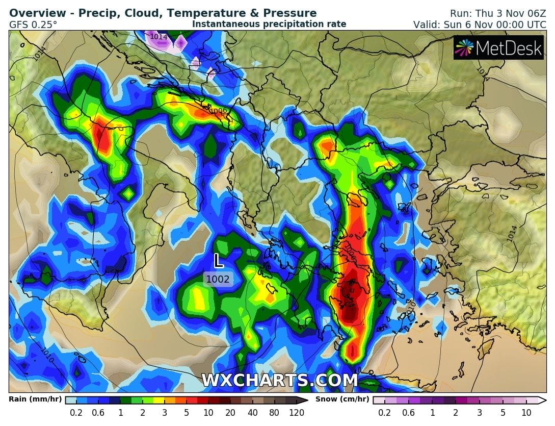 Όπως βλέπουμε στα παγκόσμια μοντέλα πρόγνωση καιρού οι μετεωορλογικές συνθήκες θα είναι ευνοικές για την εκδήλωση ισχυρών καταιγίδων ,κυριως, στα δυτικά και νότια τμήματα του νομού .