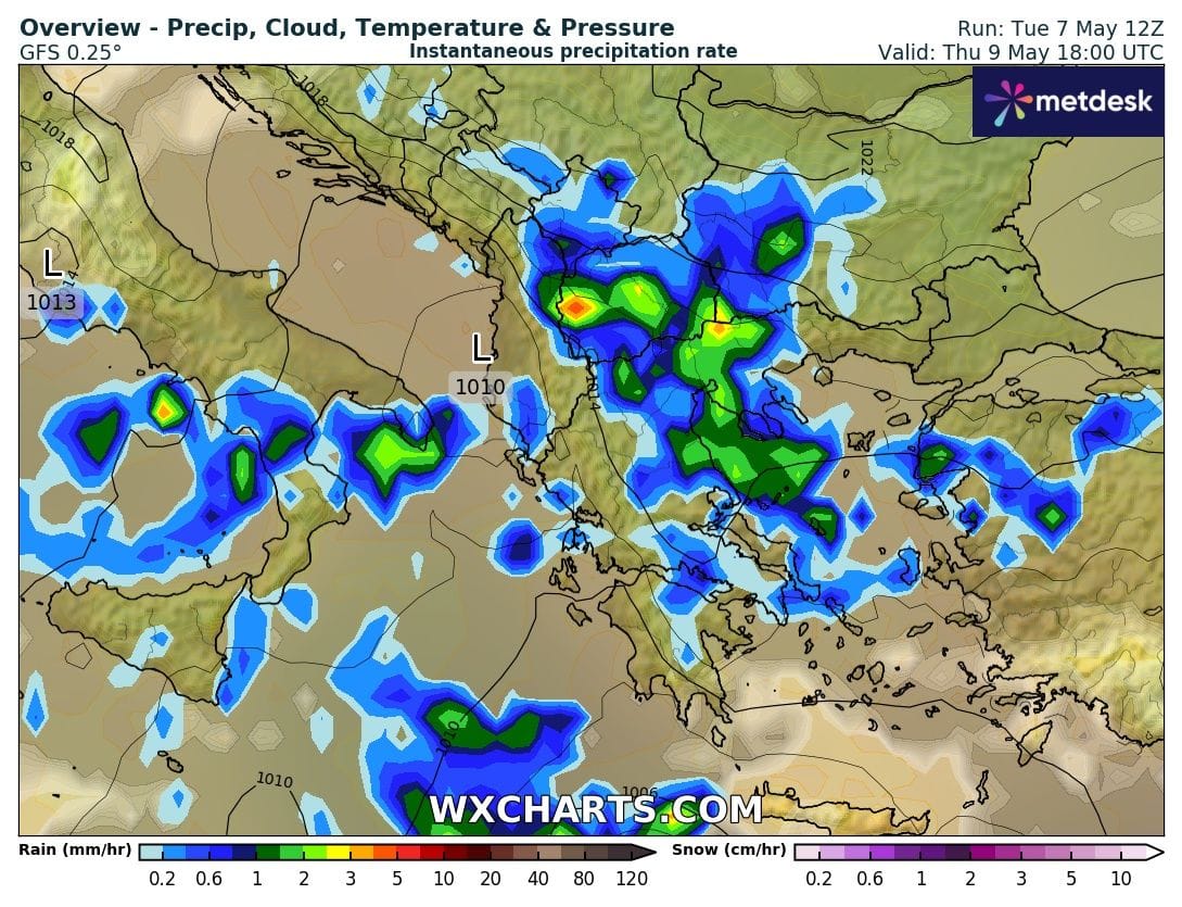 Το διήμερο Πέμπτη-Παρασκευή (9-10/5) αναμένουμε εντονότερη αστάθεια με τις βροχές και τις σποραδικές καταιγίδες να επηρεάζουν τα περισσότερα ηπειρωτικά τμήματα της χώρας ενώ υπάρχουν πιθανότητες να εκδηλωθούν τοπικές χιονοπτώσεις στα πολύ ορεινά τμήματα της βόρειας Ελλάδας.Η θερμοκρασία θα παρουσιάσει και νέα πτώση και δεν φαίνεται να ξεπερνά τους 23-24 βαθμούς Κελσίου ενώ οι άνεμοι θα στραφούν απο βόρειες διευθύνσεις φτάνοντας στο Αιγαίο ακόμα και τα 8 μποφόρ.