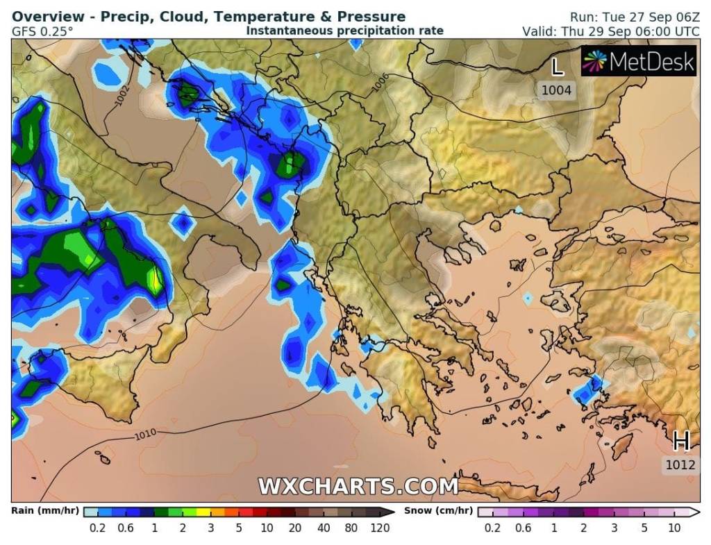 Για την Πέμπτη και σύμφωνα με τα τελευταία μετεωρολογικά στοιχεία φαίνεται οι τοπικές βροχές και οι λίγες σποραδικές καταιγίδες να συνεχίζονται στα βορειοδυτικά τμήματα της χώρας με τους νοτιοδυτικούς ανέμους να εξασθενούν και να φτάνουν τοπικά και τα 5 μποφόρ. Η θερμοκρασία θα παρουσιάσει και νέα μικρή άνοδο, και θα κυμανθεί σε υψηλά για την εποχή επίπεδα, φτάνοντας στα βόρεια τους 28 βαθμούς στα κεντρικά Ηπειρώτικα τους 30 με 31 βαθμούς ενώ στη Βόρεια Κρήτη τοπικά ο υδράργυρος θα δείξει και 33 βαθμούς Κελσίου.