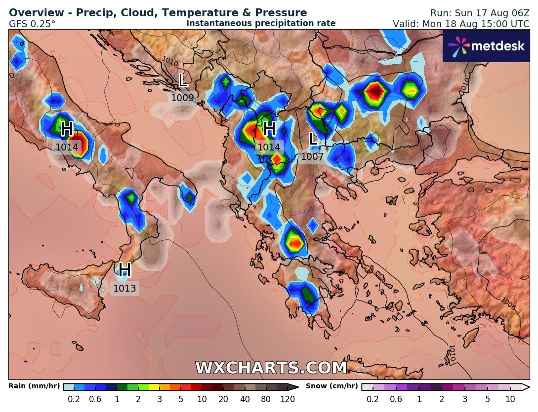 Επιστροφή της θερμικής αστάθειας την Δευτέρα και έτσι το κύριο χαρακτηριστικό του καιρού θα έιναι οι βροχές και οι σποραδικές καταιγίδες τις μεσημεριανές και απογευματινές ώρες στα κεντρικά και βόρεια ηπειρωτικά τμήματα .