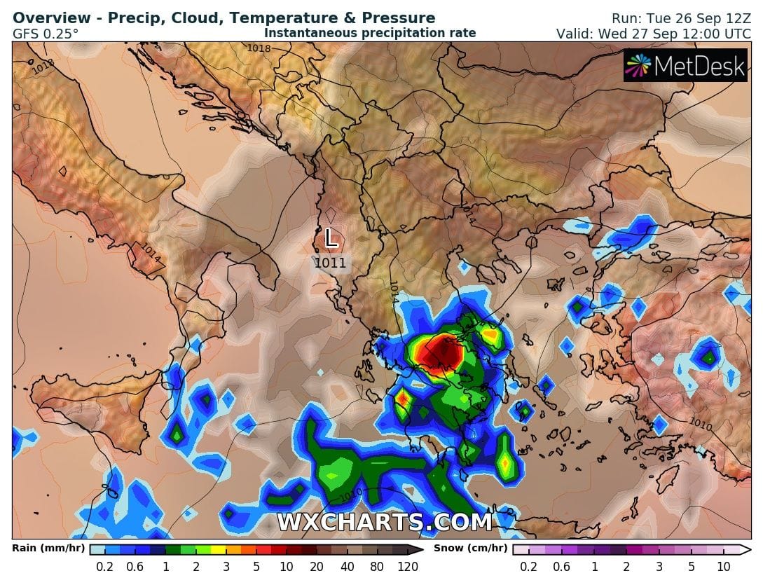 Αναλυτικά για αύριο Τετάρτη βροχές και κατά περιόδους ισχυρές καταιγίδες θα εκδηλωθούν σε περιοχές της Θεσσαλίας, στην Εύβοια, στη Στερεά, την Πελοπόννησο ,τις Σποράδες, τις δυτικές Κυκλάδες και την δυτική Κρήτη. Τα φαινόμενα κατά τόπους θα συνοδεύονται από ισχυρές χαλαζοπτώσεις. Τοπικές βροχές θα εκδηλωθούν και στα νησιά του Βόρειου και Ανατολικού Αιγαίου από τις μεσημεριανές ώρες και μετά.
