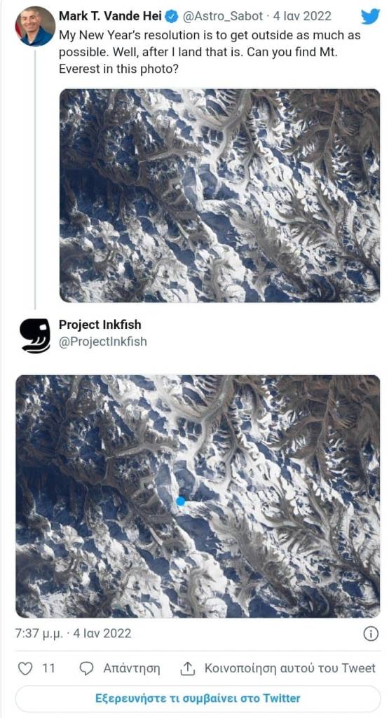 Ο Mark Vande Hei της NASA δημοσίευσε μια εκπληκτική φωτογραφία πάνω από τα Ιμαλάια στο Twitter, αφήνοντας άπαντες με ανοιχτό στόμα. Ανάμεσά του κρύβεται το Έβερεστ, το οποίο ο αστροναύτης ζήτησε από τους ανθρώπους να προσπαθήσουν να εντοπίσουν.