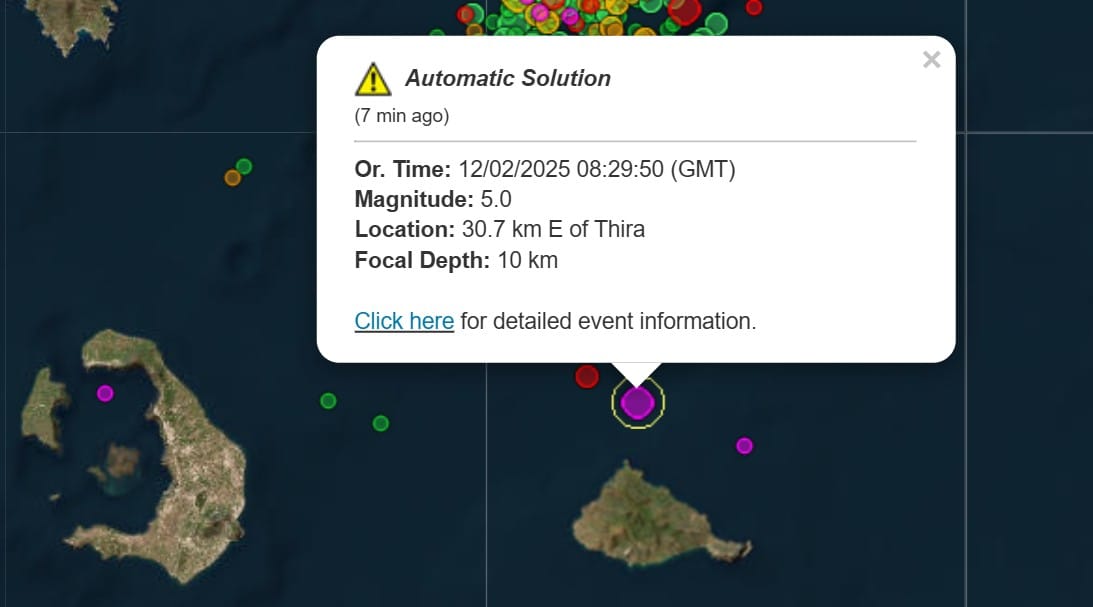 Το επίκεντρο του σεισμού εντοπίστηκε 30 χιλιόμετρα ανατολικά της Σαντορίνης και το αστιακό βάθος ήταν στα 10 περίπου χιλιόμετρα.