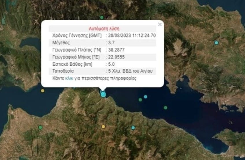 Σεισμική δόνηση της τάξεως των 3,7 βαθμών της κλίμακας Ρίχτερ σημειώθηκε λίγο μετά τις 14:00 με επίκεντρο το Αίγιο. Το εστιακό του βάθος εντοπίστηκε στα 5 περίπου χλμ.
