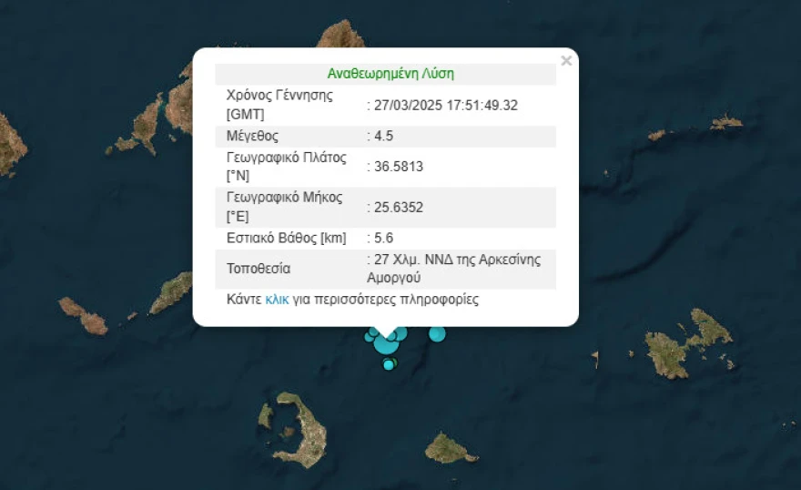 Σύμφωνα με την αναθεωρημένη λύση του Γεωδυναμικού Ινστιτούτου, η σεισμική δόνηση είχε επίκεντρο 27 χιλιόμετρα νότια – νοτιοδυτικά της Αρκεσίνης Αμοργού.