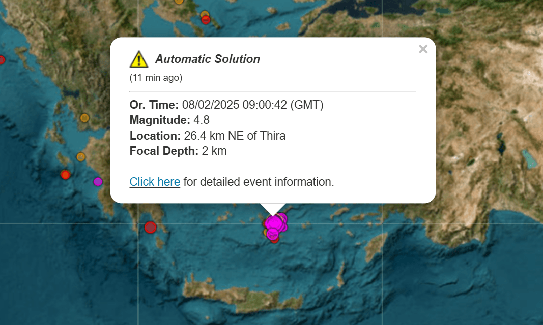 5 νέες σεισμικές δονήσεις πάνω απο 4 Ρίχτερ καταγράφηκαν την τελευταία ώρα μεταξύ Σαντορίνης και Αμοργού