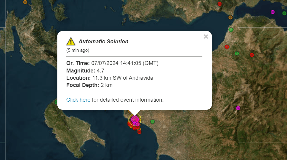 Σύμφωνα με τα πρώτα στοιχεία το επίκεντρο του σεισμού εντοπίστηκε 11 χιλιόμετρα νοτιοδυτικά της Ανδραβίδας.