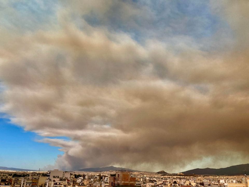 Καπνοί, αλλά και στάχτες από τις φλόγες της πυρκαγιάς στον Βαρνάβα έχουν σκεπάσει τον ουρανό της Αττικής, δημιουργώντας ένα δυστοπικό τοπίο, «πνιγμένο» στο μαύρο.