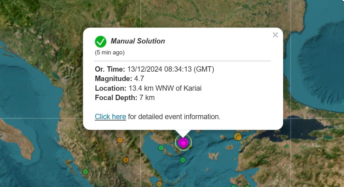 Σεισμική δόνηση της τάξως των 4,7 βαθμών της κλίμακας Ρίχτερ σημειώθηκε πρίν απο λίγο στο Άγιο όρος 11 χιλιόμετρα δυτικά βορειοδυτικά των Καρυών.
