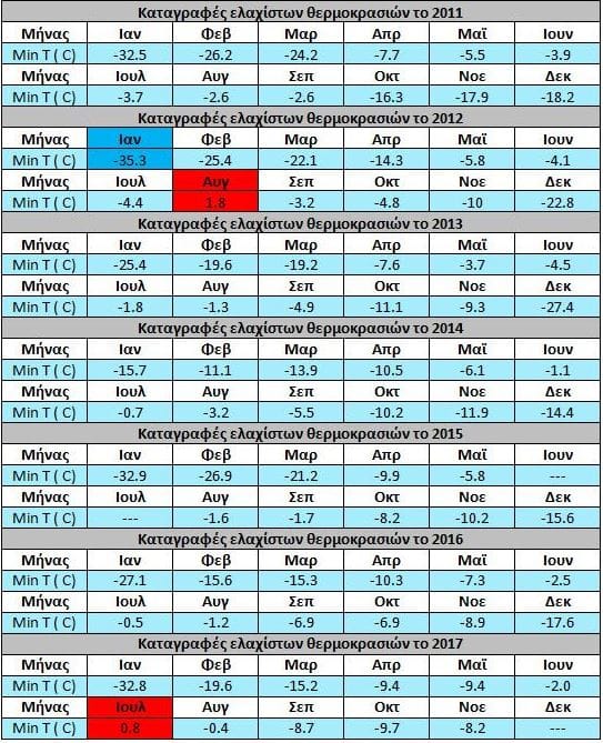 Οι ελάχιστες θερμοκρασίες στην Κεχρωτή την περίοδο 2011-2017