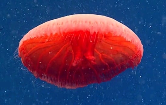 Η τεράστια αυτή μέδουσα του γένους Stygiomedusa gigantea εντοπίστηκε σε βάθος 1000 μέτρων στον κόλπο του Μοντερέϊ. Το κεφάλι της έχει πλάτος ένα μέτρο και τα πλοκάμια της απλώνονται στα 10 μέτρα.