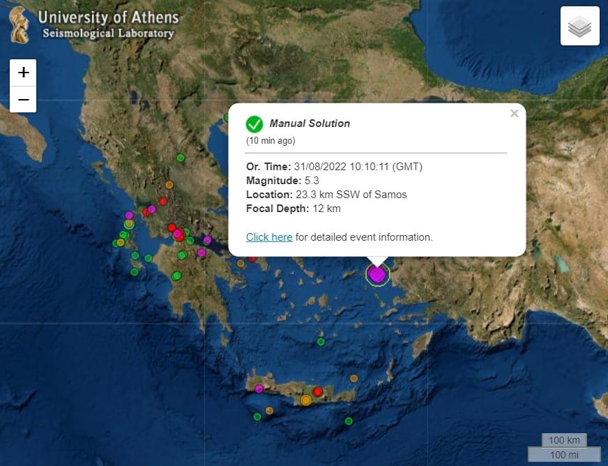Ισχυρή σεισμική δόνηση της τάξεως των 5,3 βαθμών της κλίμακας Ρίχτερ σημειώθηκε πρίν απο λίγα λεπτά στην Σάμο .