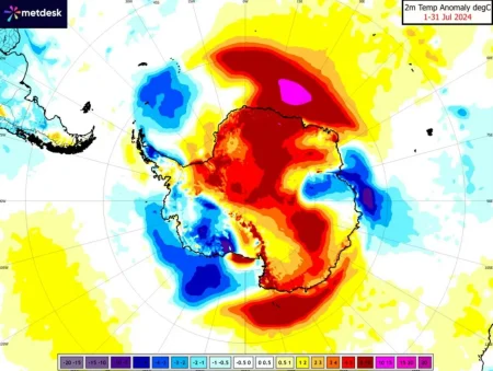 Ενώ οι θερμοκρασίες παραμένουν κάτω από το μηδέν στην πολική χερσαία μάζα, η οποία καλύπτεται από το σκοτάδι αυτή την εποχή του έτους, στα βάθη του χειμώνα στο νότιο ημισφαίριο, οι θερμοκρασίες φέρεται να έχουν φτάσει τους 28 βαθμούς Κελσίου, πάνω από το προσδοκώμενο.